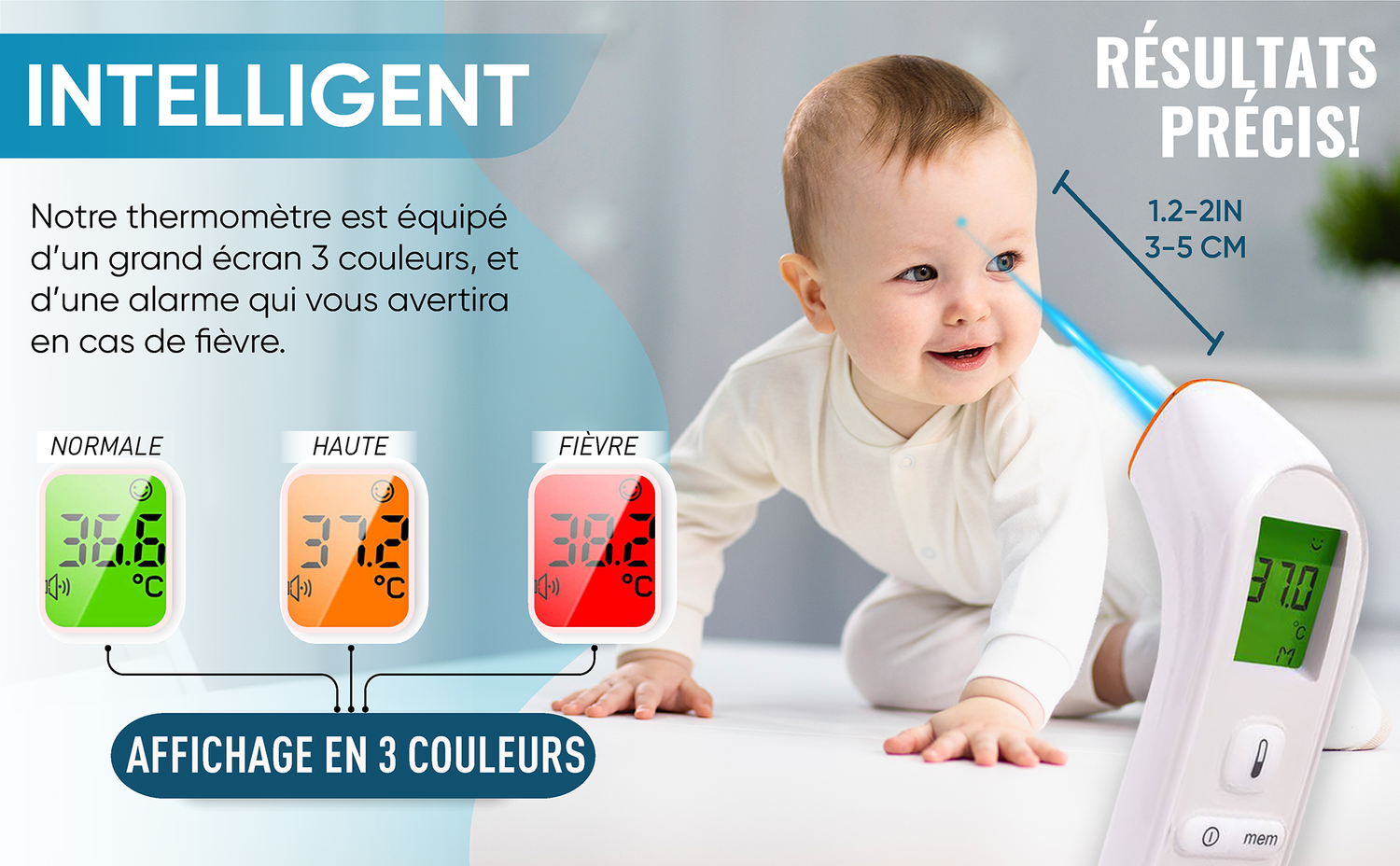Alarme de fièvre: Notre thermomètre est équipé d’une alarme de type Fever Glow sonore et visuelle dont la couleur révèle si la température est normale (vert), haute (orange) ou à un niveau indicatif de fièvre (rouge).