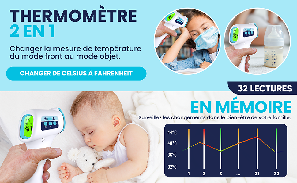 Vraiment, notre thermomètre numérique sans contact pour adultes et bébés, sa conception intelligente et ses fonctionnalités spéciales - telles qu'une alarme de fièvre ou la possibilité d'enregistrer jusqu'à 32 lectures pour un suivi plus pratique - en font un incontournable pour les familles.