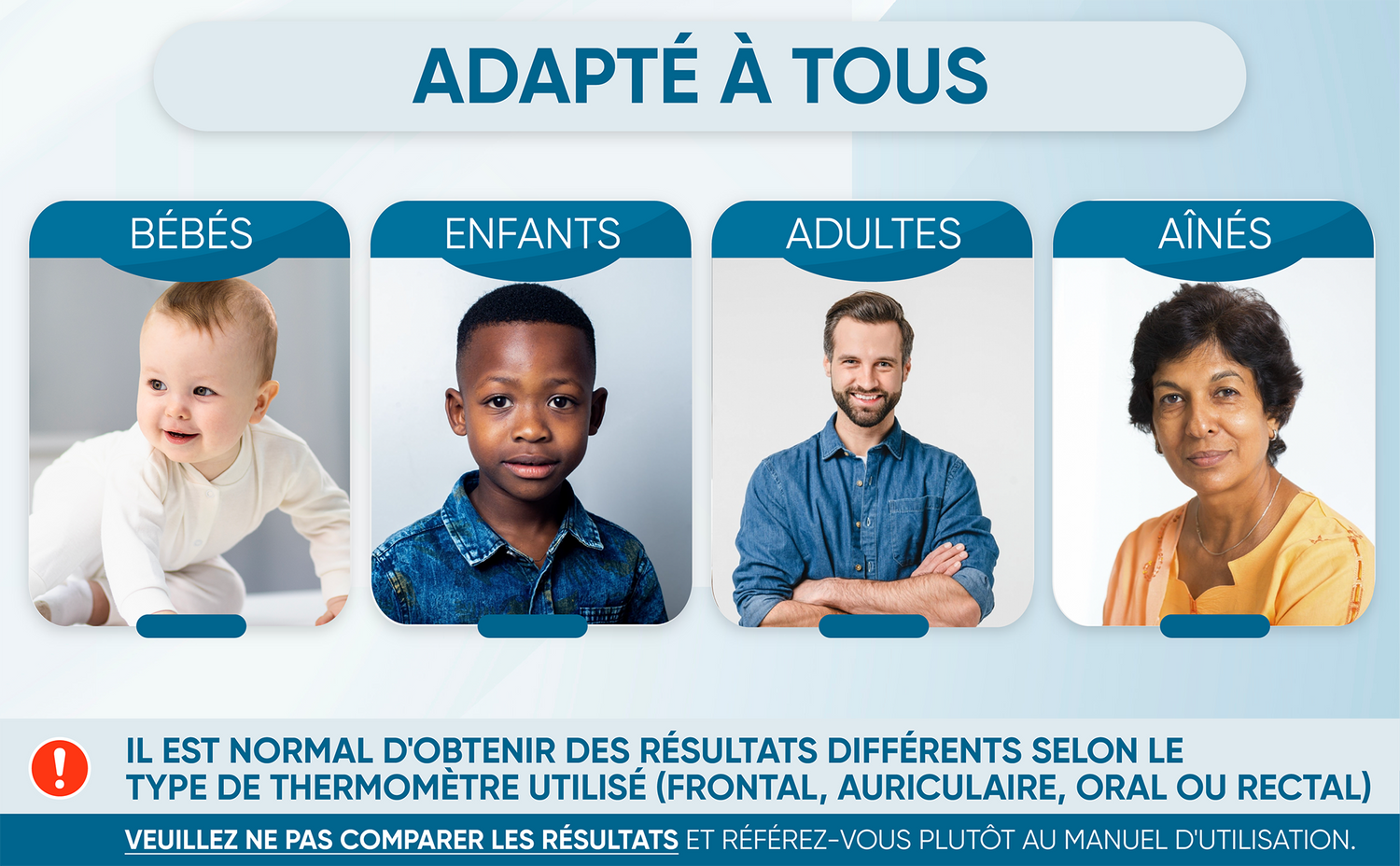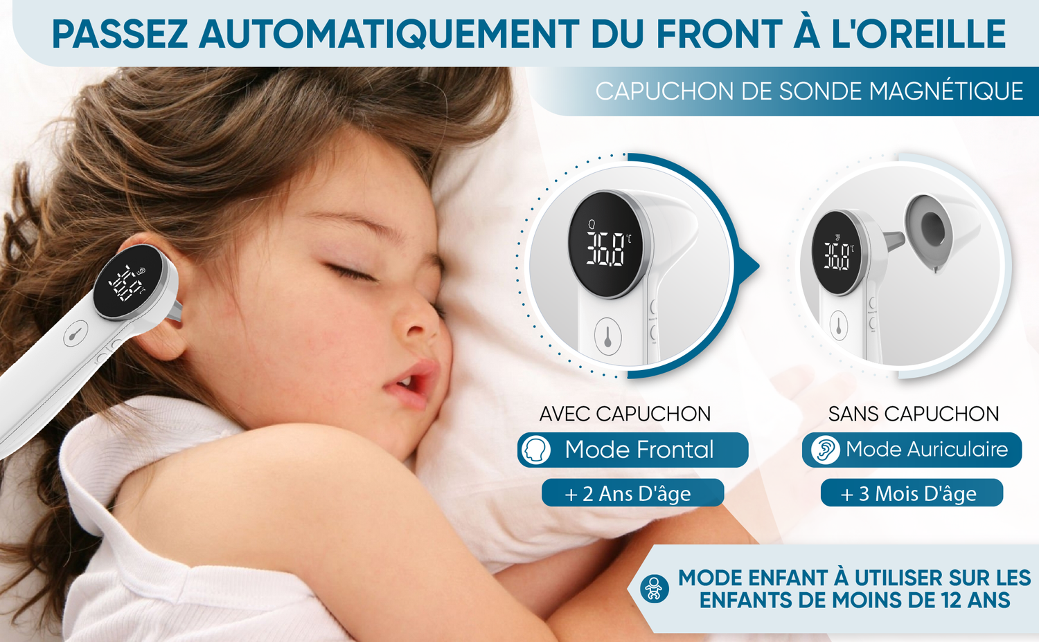 4 modes en 1: Notre thermomètre offre quatre différents modes de mesure de la température: Front (2 ans et plus); Oreille (3 mois et plus); Enfant (moins de 12 ans); et Objet (par exemple, pour les biberons). Vous pouvez passer du mode Front à Oreille automatiquement en retirant la couverture de la sonde magnétique.
