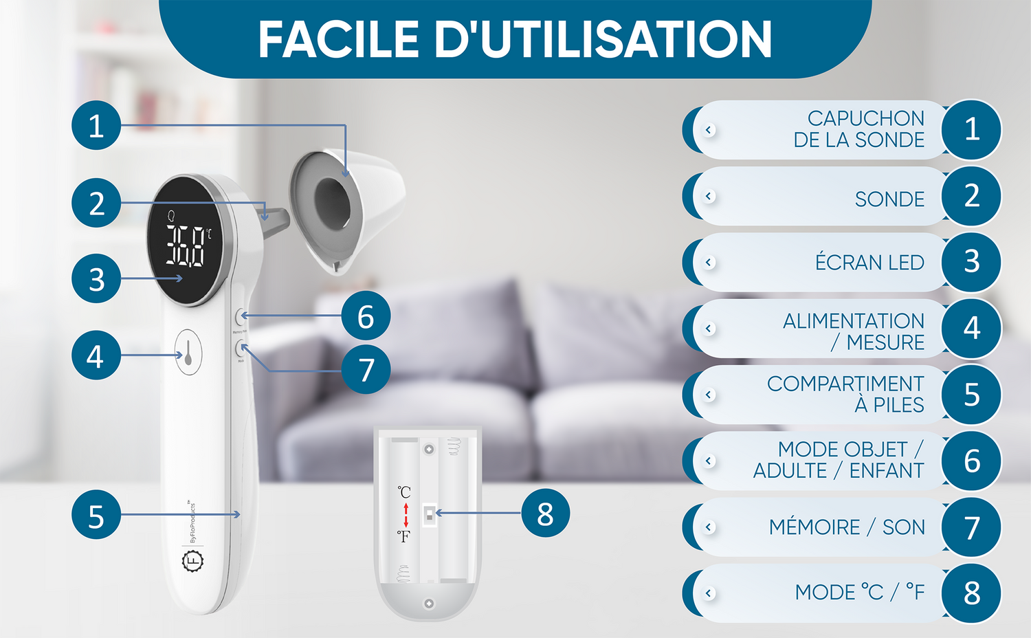 Thermomètre frontal, auriculaire et pour objet ByFloProducts (JPD-FR403)