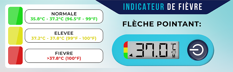 Indicateur de fièvre : Notre thermomètre médical vous permet de comprendre votre état de santé en un instant grâce à notre indicateur de fièvre unique. Le vert signale une température normale, le jaune prévient d'une légère fièvre et le rouge signale une forte fièvre. Prenez des décisions éclairées en matière de santé en un coup d’œil