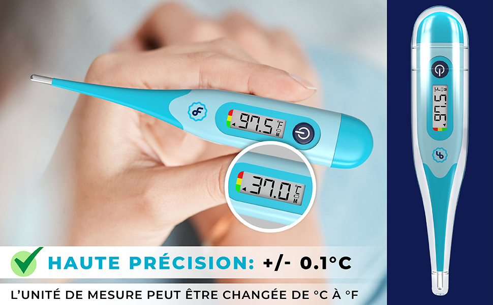 La précision rencontre la flexibilité : obtenez des lectures de température précises à +/- 0,1 °C avec le confort supplémentaire d'une pointe flexible. Notre thermomètre numérique garantit une expérience confortable et sûre, ce qui en fait un excellent choix pour les bébés en mouvement ou comme thermomètre basal corporel.