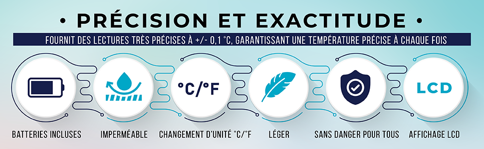 Caractéristiques conviviales : Notre thermomètre comprend un arrêt automatique, une alerte de batterie faible et une mémoire de dernière lecture. Il offre également la commutation Celsius/Fahrenheit en appuyant simplement sur le bouton pendant 2 secondes. Un écran LCD clair et un poids léger en font un jeu d’enfant à utiliser.