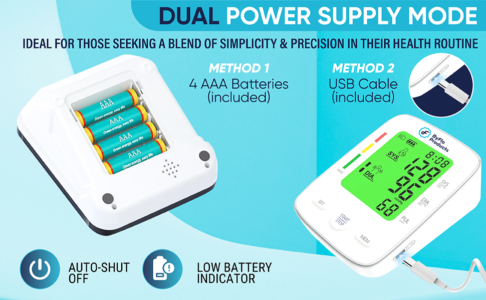- USER-FRIENDLY DESIGN & VERSATILE POWER OPTIONS - The ByFloProducts Blood Pressure Monitor simplifies health management with its one-button operation. Powered by either USB connection (Included) or 4 AAA batteries (Included), it offers unparalleled convenience and reliability, whether at home or on the move. Ideal for those seeking a blend of simplicity and precision in their health routine.