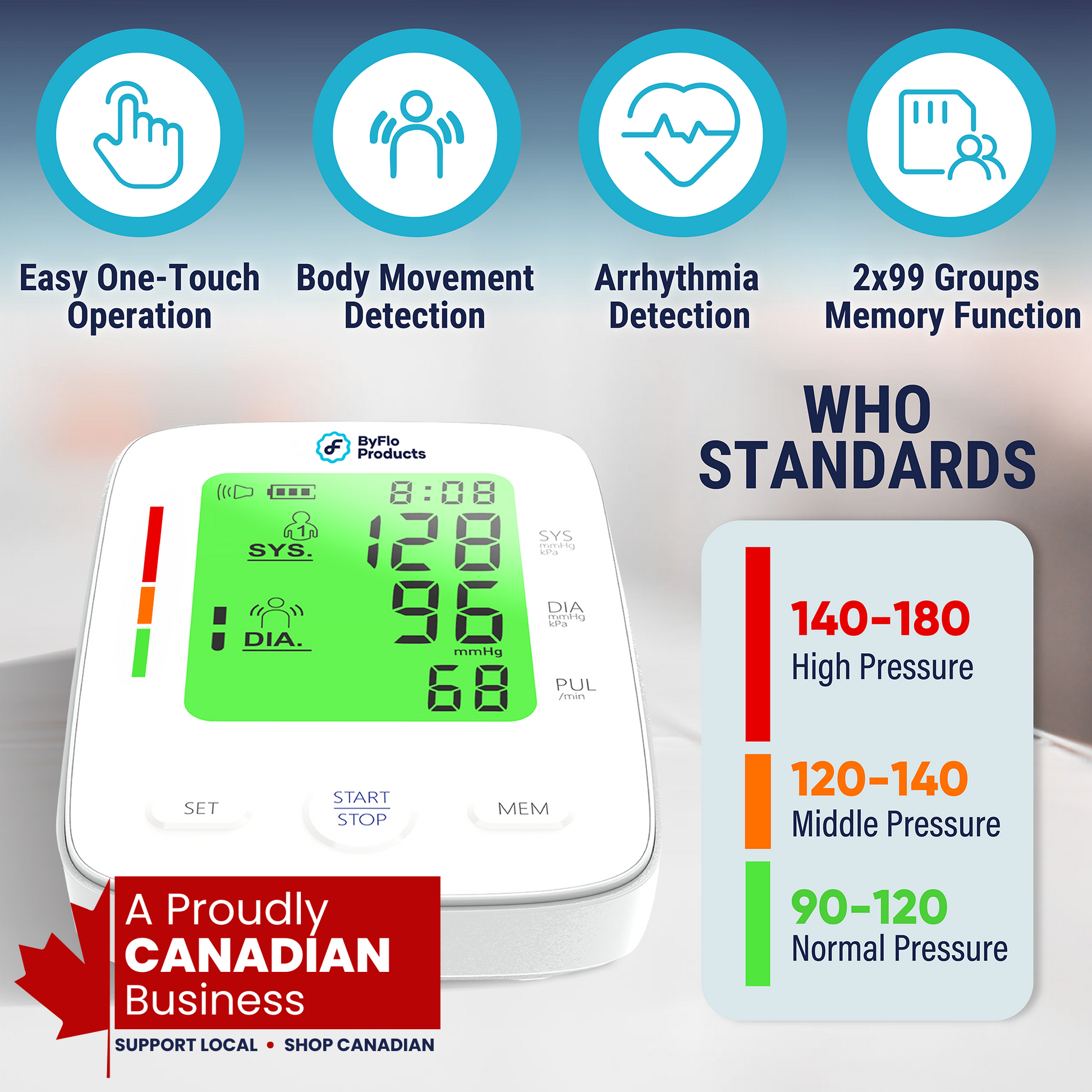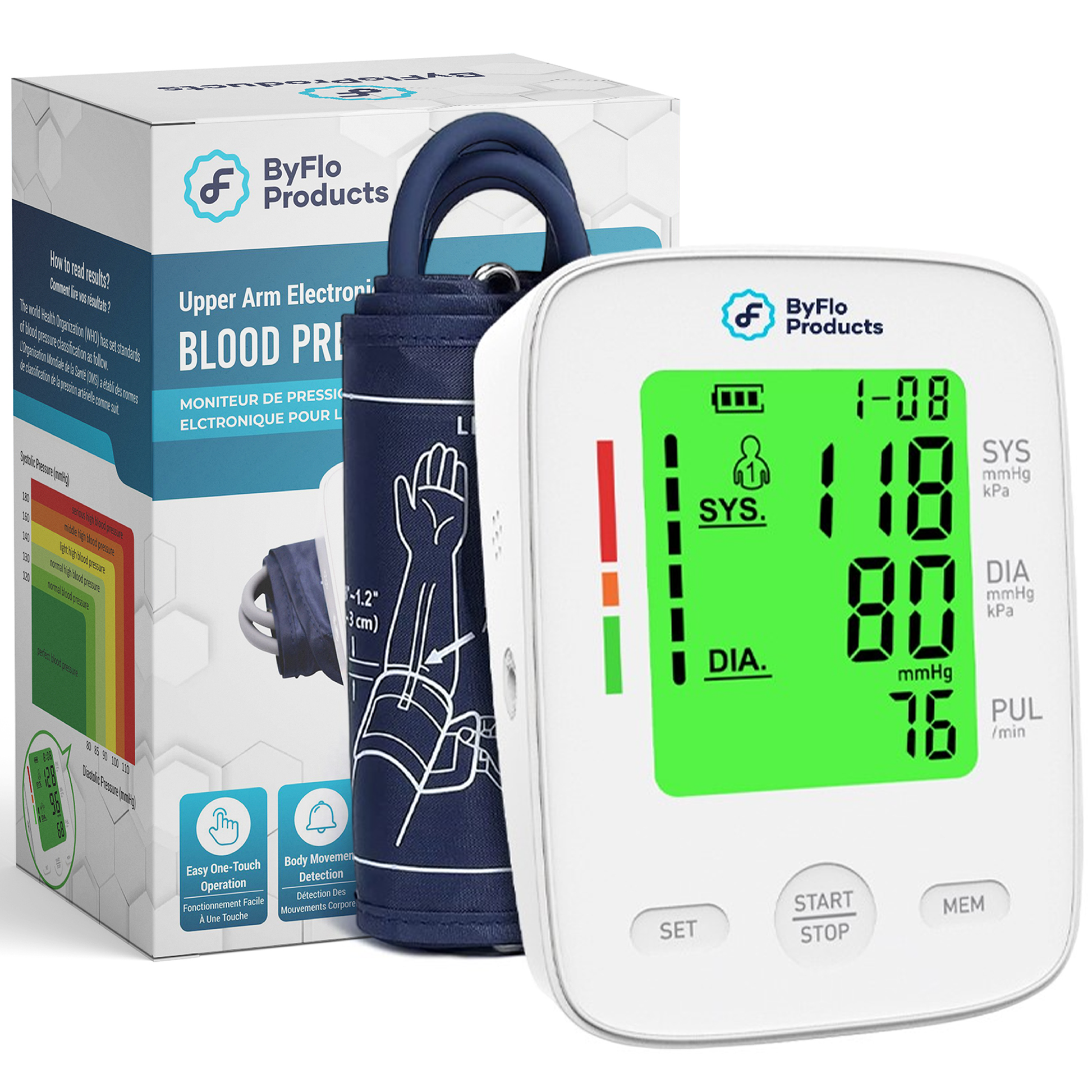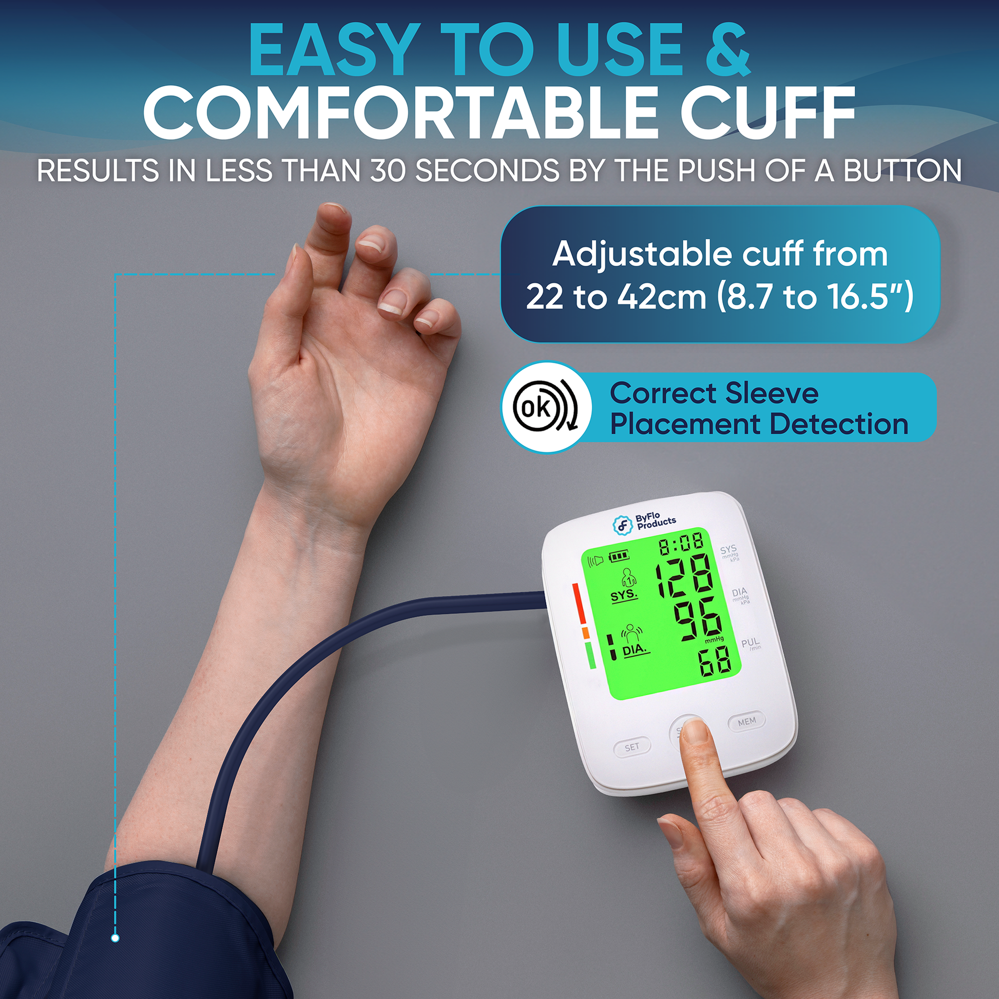 - ADVANCED ACCURACY WITH QUICK Results - ByFloProducts introduces cutting-edge technology for your health monitoring needs. Our blood pressure machine incorporates a sophisticated chip for rapid data processing, delivering precise measurements in under a minute. Includes arrhythmia detection and body movement detection for an accurate assessment every time. Clinically validated for accuracy, our monitor ensures you can confidently track your health metrics.