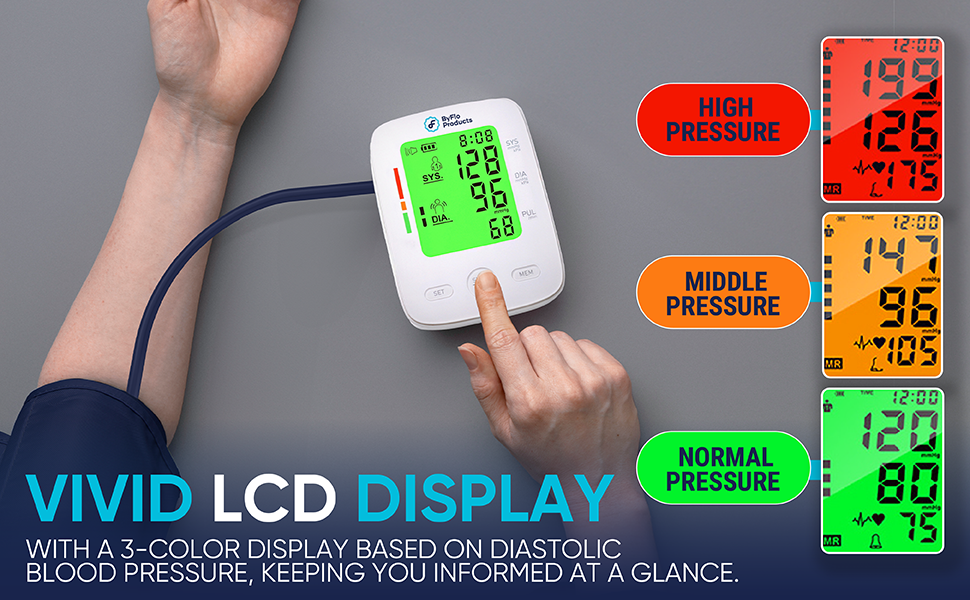 - INTUITIVE DISPLAY WITH COLOR-GUIDED READINGS - Experience the clarity of our Blood Pressure Monitor for Home Use with its vibrant LCD screen, showcasing not just your readings but also including date, time, and user profiles. Its color-coded system - Green (Normal), Yellow (Moderate), and Red (High) - provides an at-a-glance understanding of your blood pressure levels, enhancing readability under any lighting condition.
