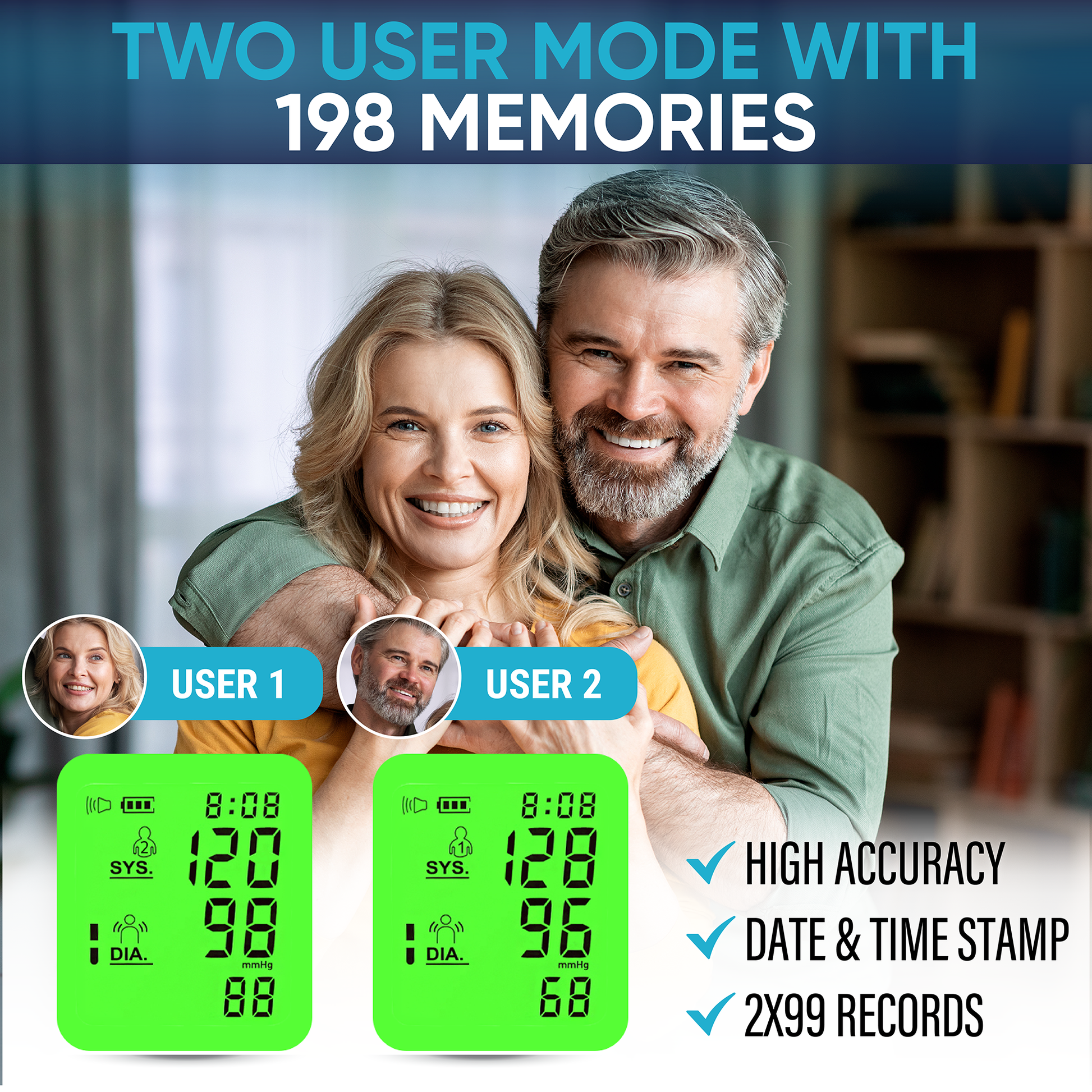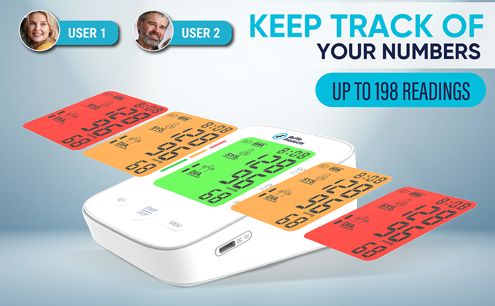 - DUAL-USER FUNCTIONALITY & GENEROUS MEMORY STORAGE - Designed with family health in mind, this BP machine for home accommodates 2 users profiles, each with the ability to store up to 99 readings. This expansive memory, complete with timestamps, offers a comprehensive view of your health trends without the hassle of manual logging, perfect for regular monitoring.