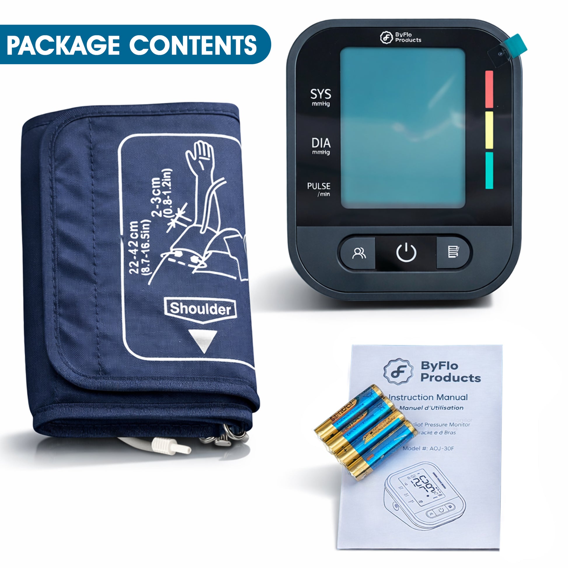 ByFloProducts Blood Pressure Monitor for Home Use – Digital Heart Rate Monitor with Backlit LCD Screen, Includes Blood Pressure Cuff, 4 AAA Batteries, Perfect Automatic Blood Pressure Machine (AOJ-30F)