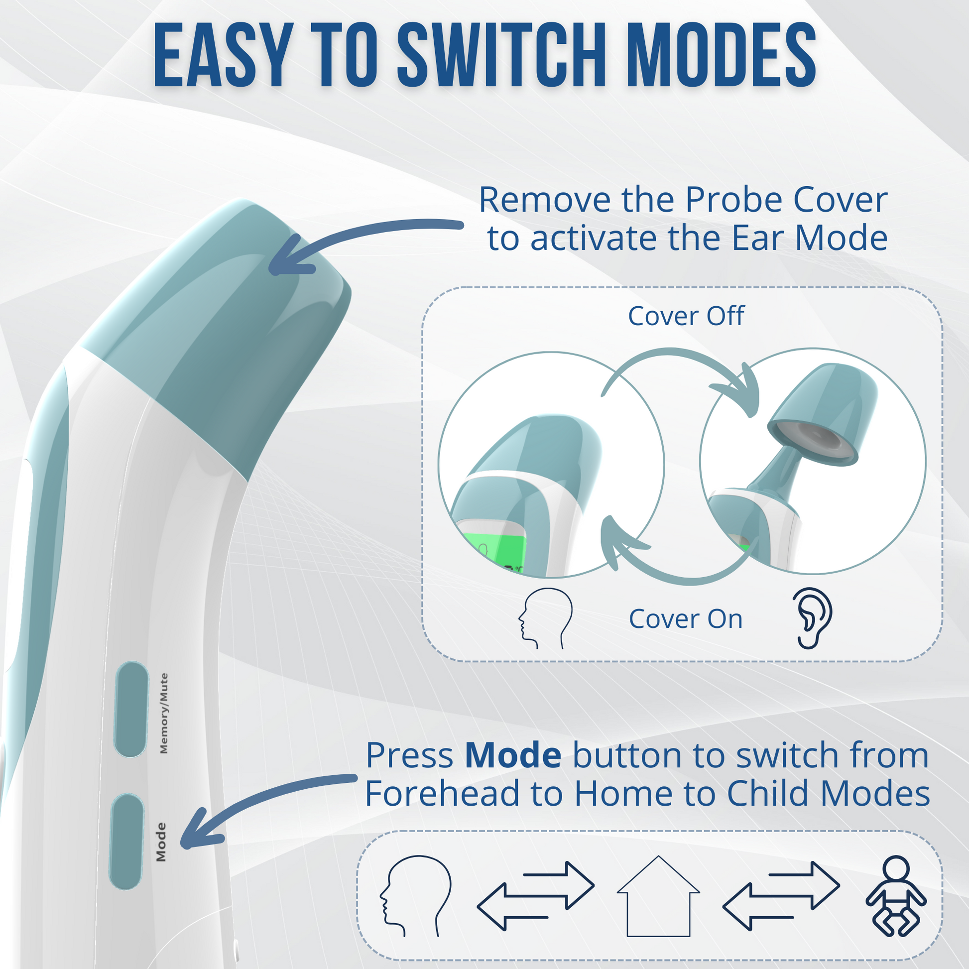 4-in-1: Our thermometer offers 4 different modes for temperature measurements: Forehead (+2 years old), Ear (+3 months old), Child (under 12 years old), and Object (such as your baby bottles). You can also switch automatically from Forehead to Ear mode by removing the magnetic probe cover.