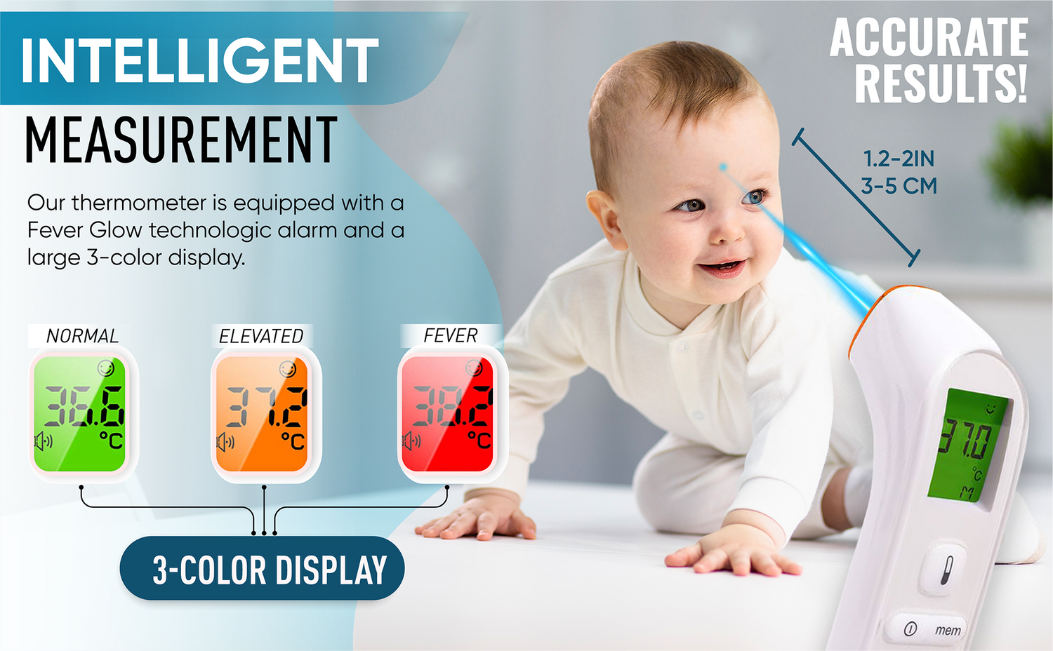 Fever alarm: Our Digital Forehead Thermometer is equipped with a Fever Glow fever alarm. One of three colors will indicate a temperature at normal (green), elevated (orange), or fever (red) level.