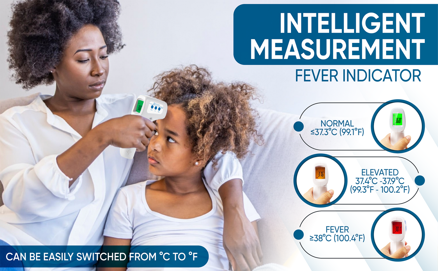 Fever alarm: Our Body, Surface & Room Touchless Thermometer is equipped with a Fever Glow fever alarm. One of three colors will indicate a temperature at normal (green), high (orange), or fever level (red).