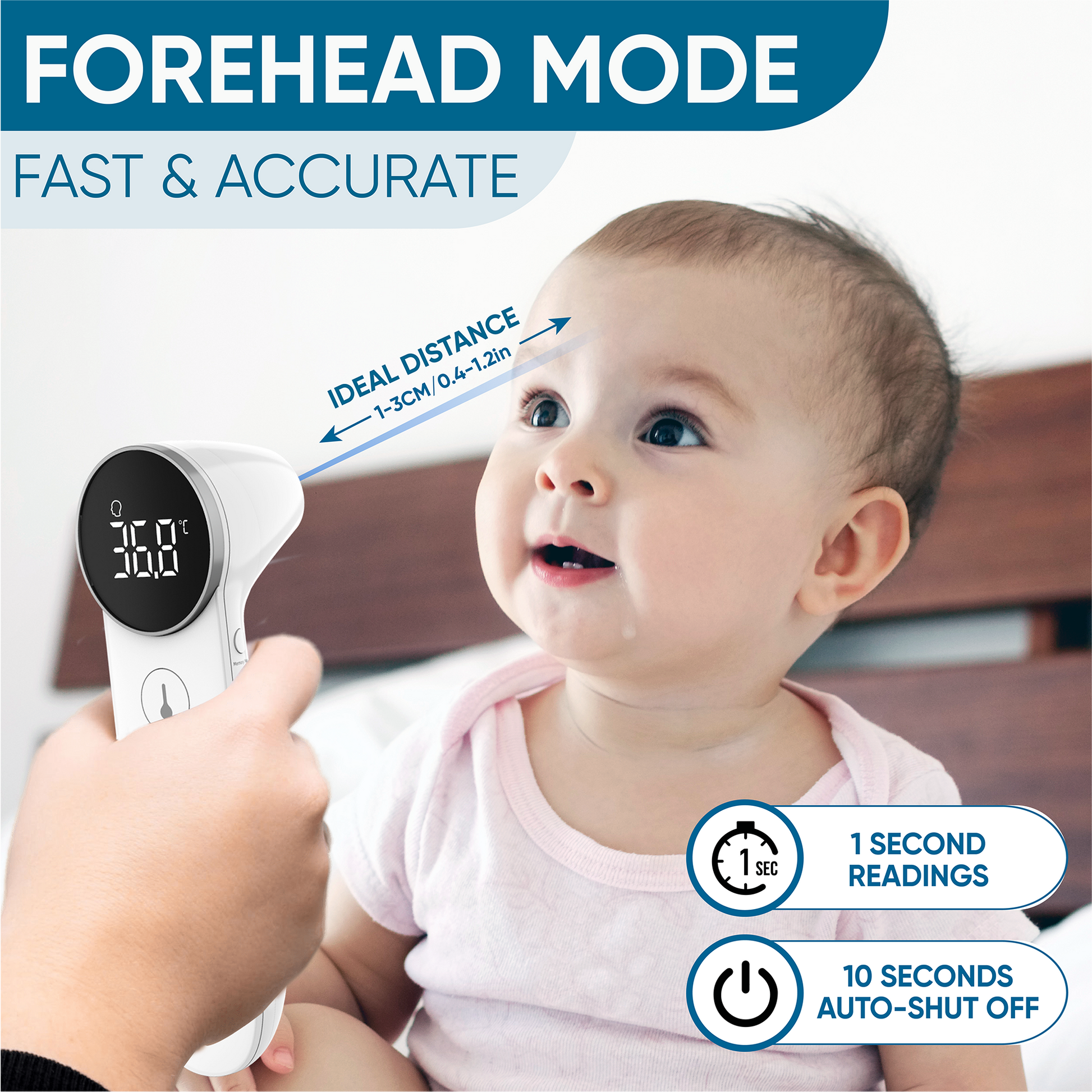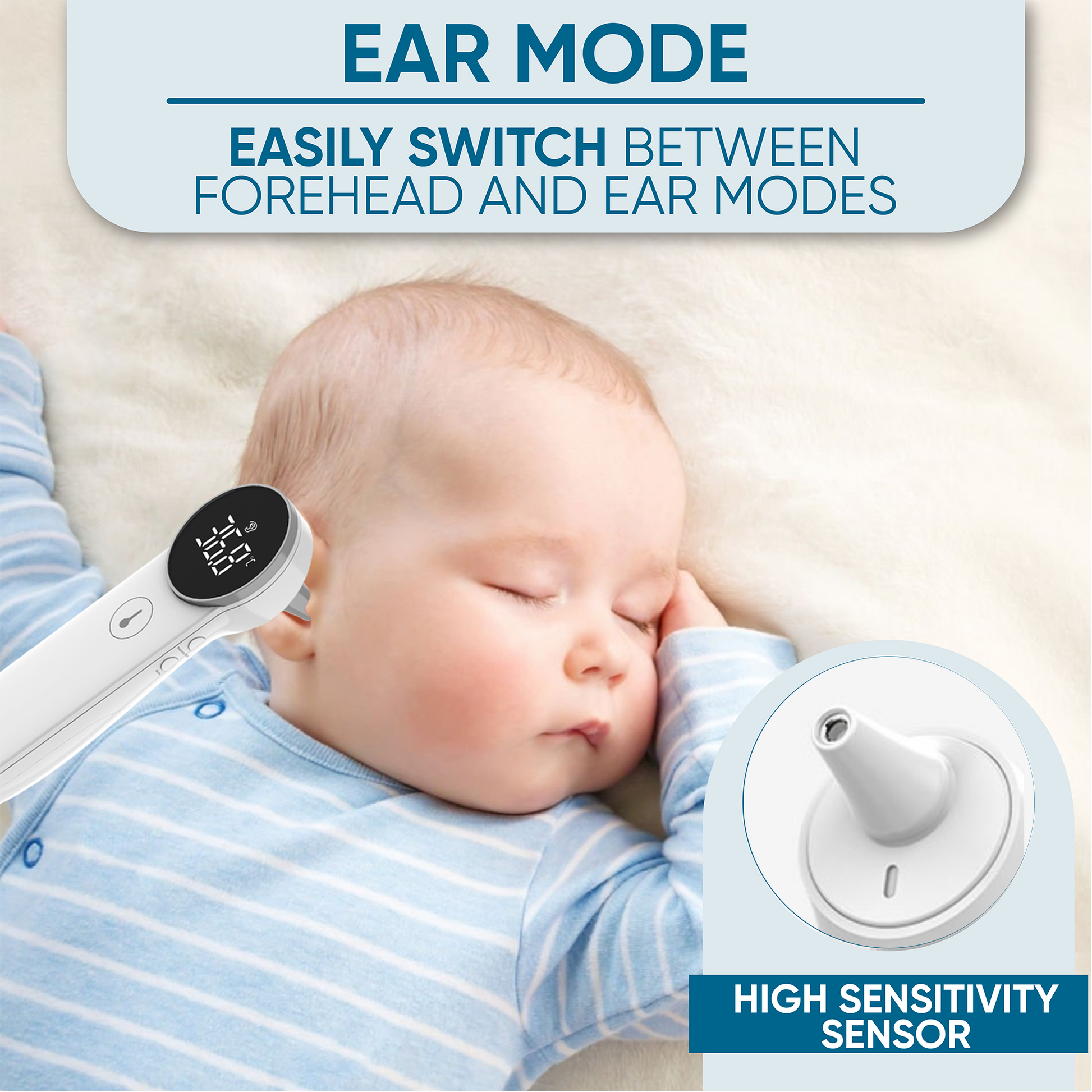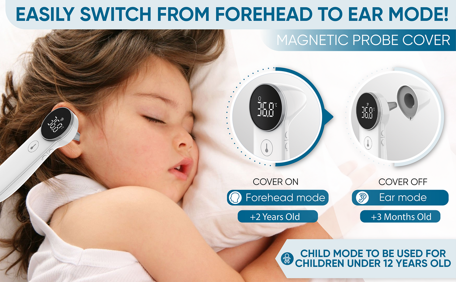 4-in-1 modes: Our thermometer offers 4 different modes for temperature measurements: Forehead (+2 years old), Ear (+3 months old), Child (under 12 years old), and Object (such as your baby bottles). You can also switch automatically from Forehead to Ear mode by removing the magnetic probe cover.