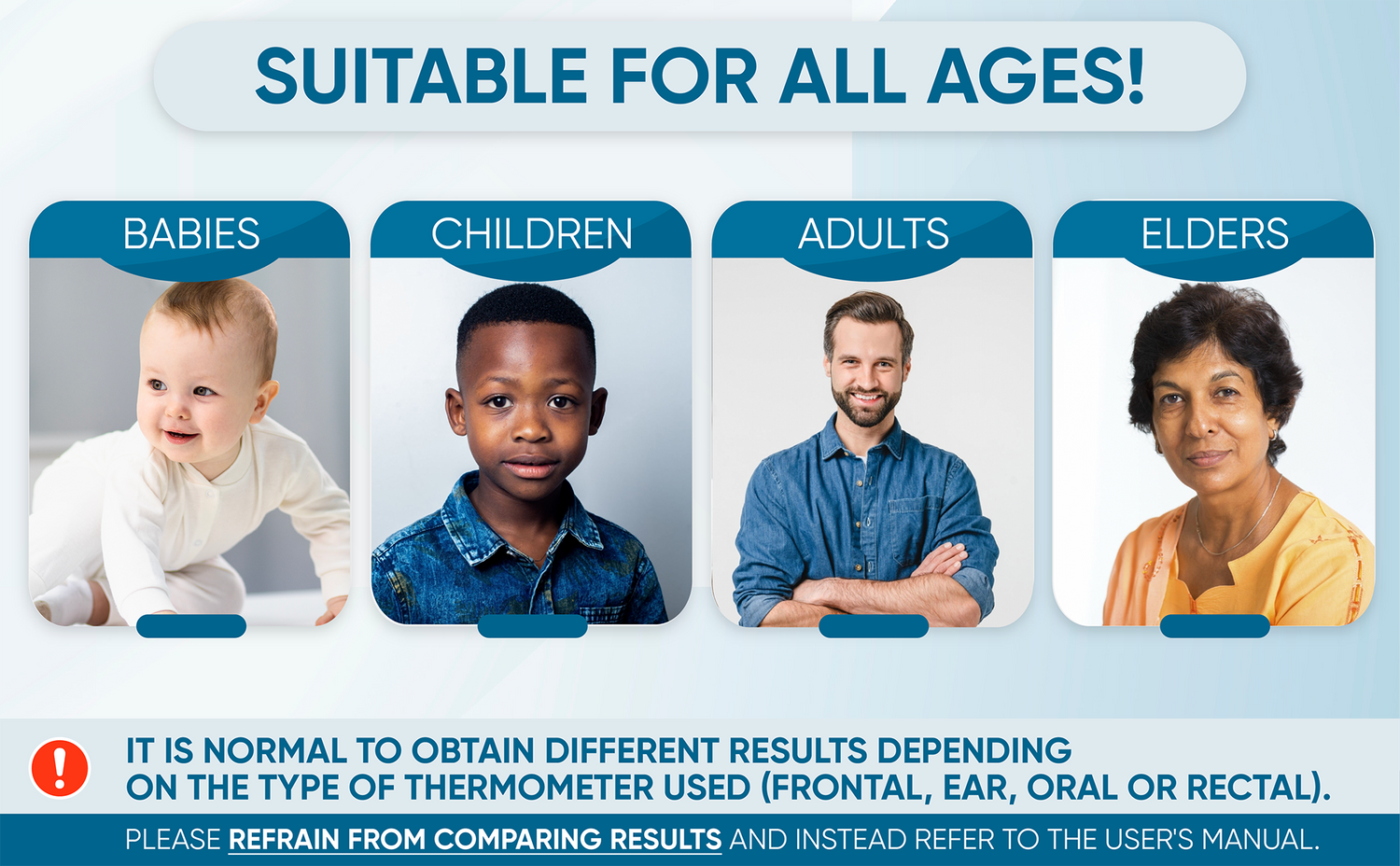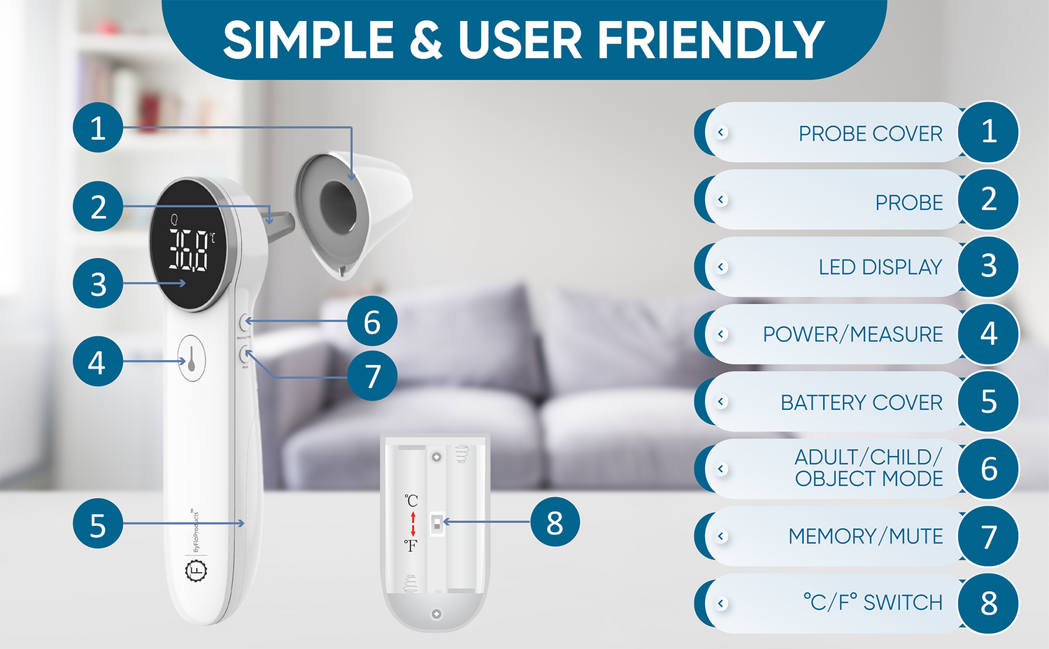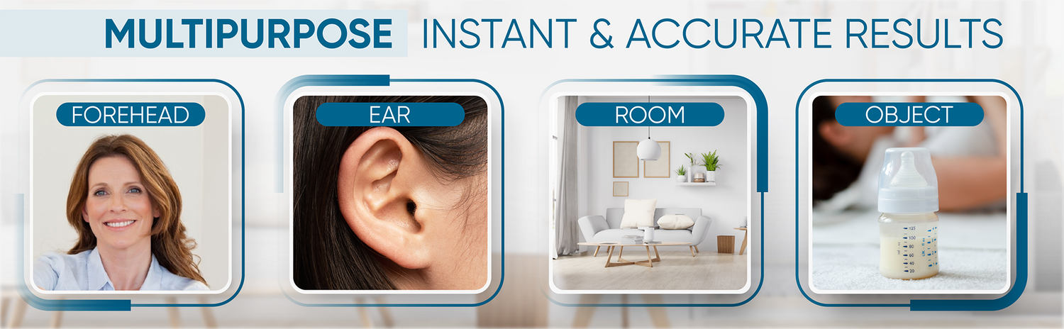 4-in-1 modes: Our thermometer offers 4 different modes for temperature measurements: Forehead (+2 years old), Ear (+3 months old), Child (under 12 years old), and Object (such as your baby bottles). You can also switch automatically from Forehead to Ear mode by removing the magnetic probe cover.