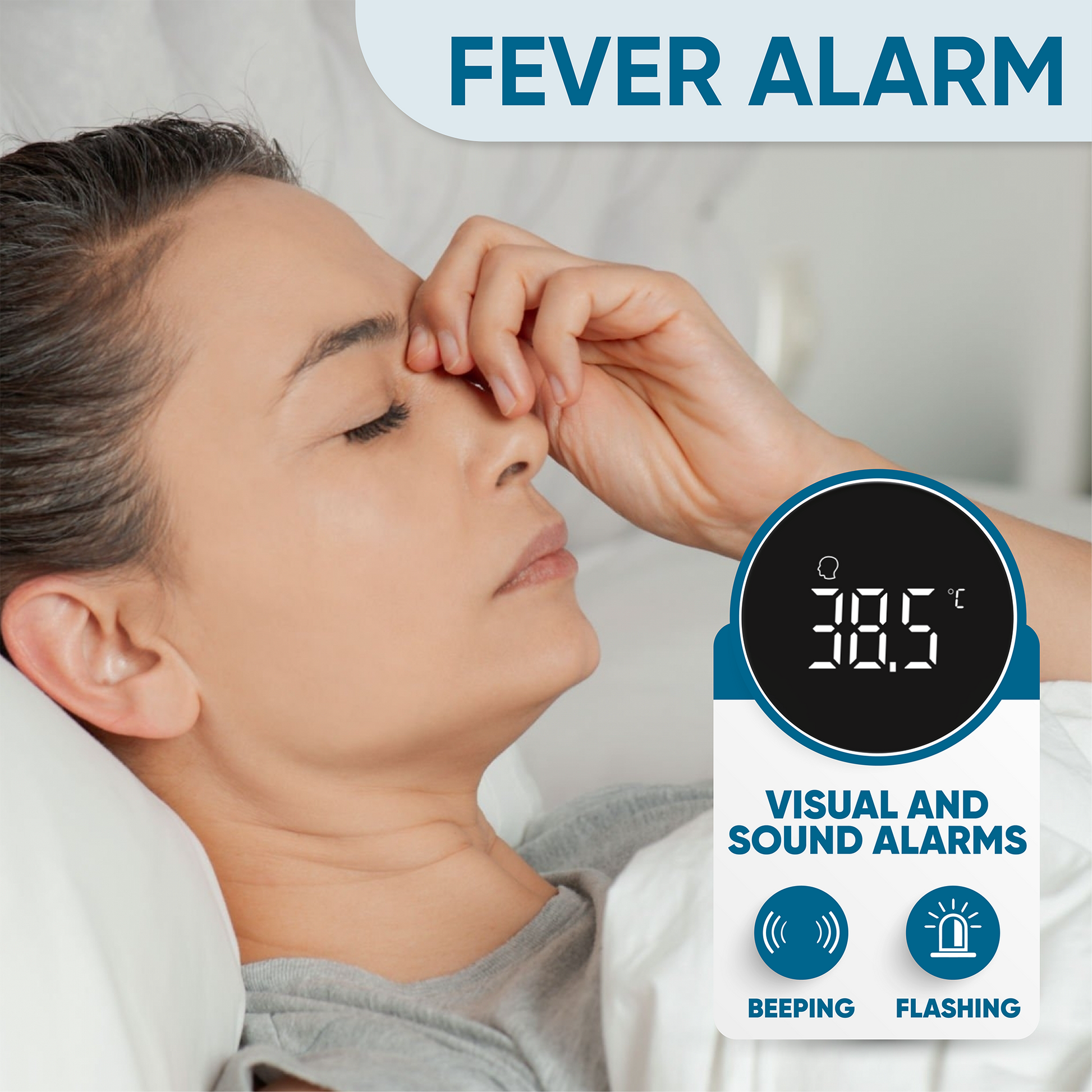 Fever alarm: Our smart thermometer will alert you in case of suspected fever via visual and auditory warnings! If a high temperature is detected, the thermometer value will flash, accompanied by 3 short double beeps!