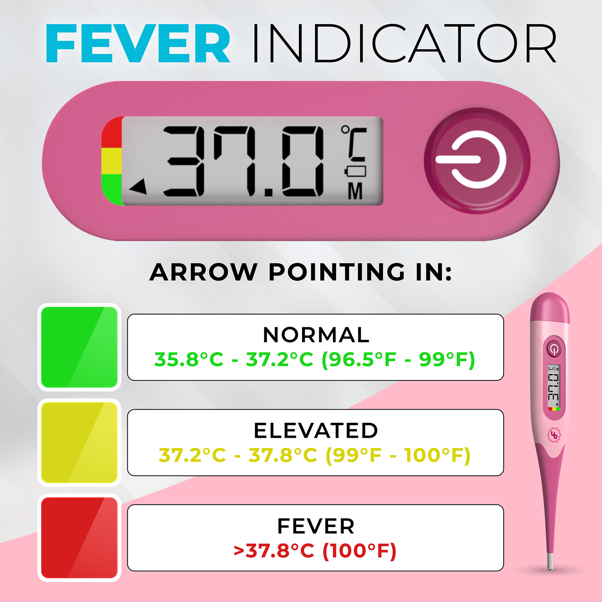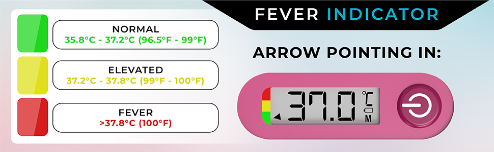 Fever Indicator: Our medical thermometer allows you to understand your health situation in an instant with our unique fever indicator. Green signals a normal temperature, yellow warns of a slight fever, and red alerts a high fever. Make informed health decisions at a glance